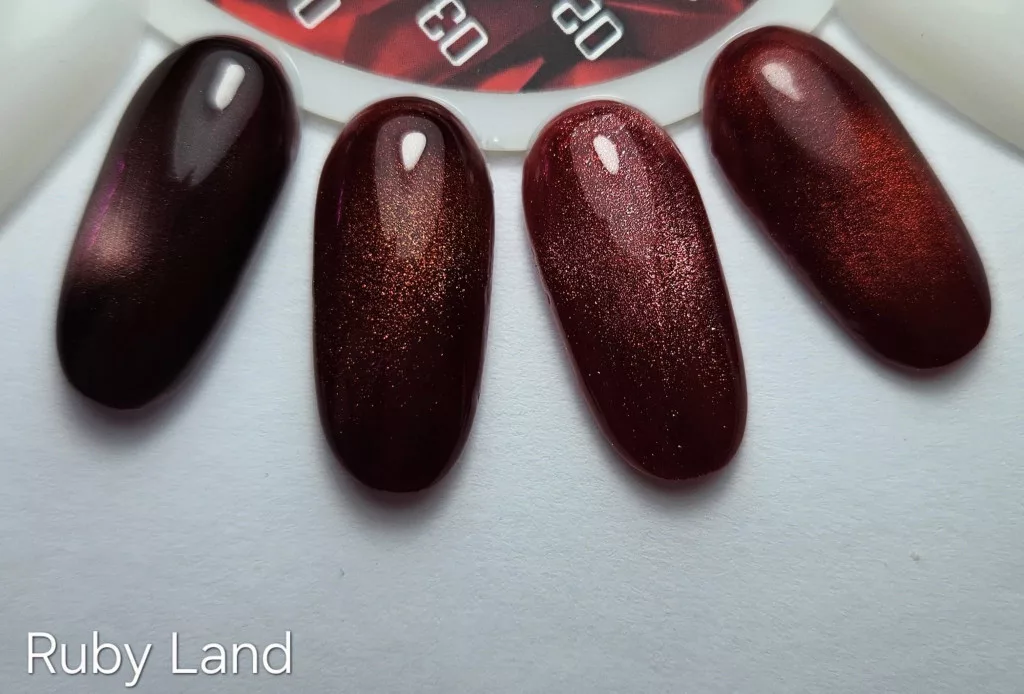 Die Rubyland-Kollektion wurde für die komplette Nagelabdeckung und magnetische Designs entwickelt. Die speziellen Pigmente reagieren auf den Magneten und erzeugen einen eleganten rubinroten Cat-Eye-Effekt.