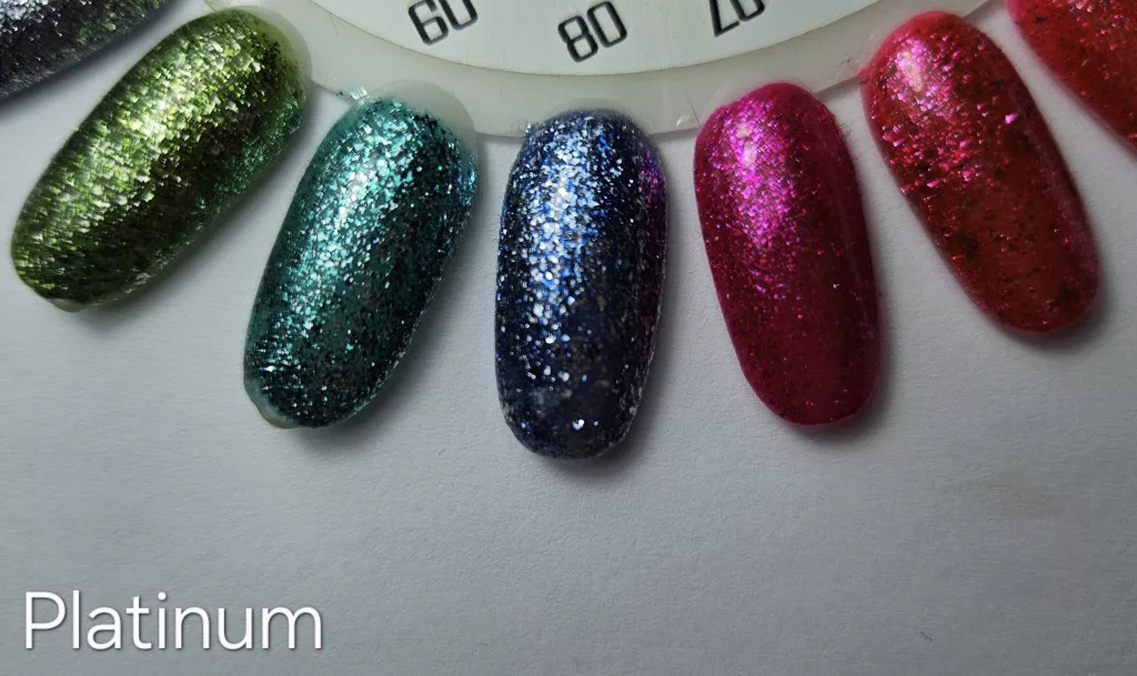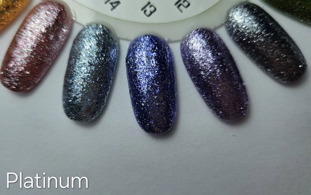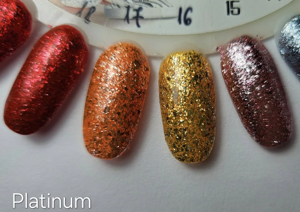Die Gellack-Kollektion Platinum von der Marke Nailgel verleiht den Nägeln deiner Kunden einen besonderen Glanz. Diese Gellacke sind metallisch leuchtend glänzend und haben eine hohe Abriebfestigkeit. Dank des metallischen Effekts wirken diese Gellacke, als wären die Nägel mit winzigen Chromfolien bedeckt.